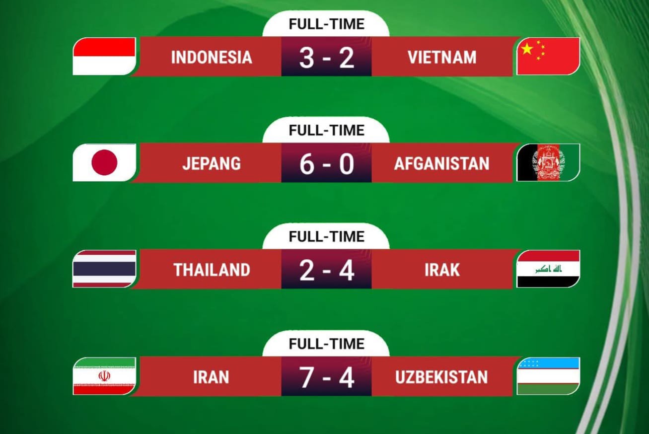 Sementara kekuatan Asia lainnya juga menunjukkan dominasinya: Jepang pesta gol 6–0 atas Afghanistan, Irak menyingkirkan Thailand 4–2, dan Iran menang telak 7–4 melawan Uzbekistan.