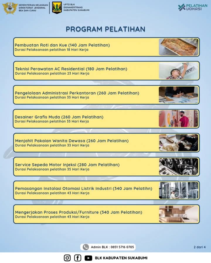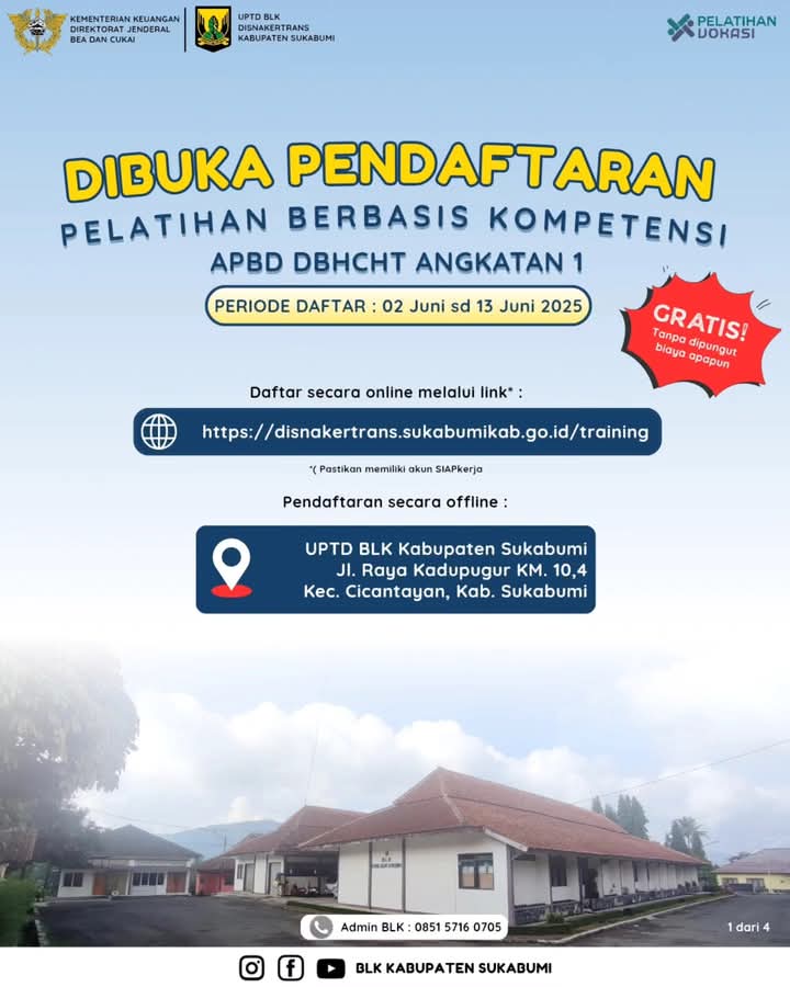 BLK Kabupaten Sukabumi kembali membuka Pendaftaran Pelatihan APBD DBHCHT Angkatan 1 TA 2025,