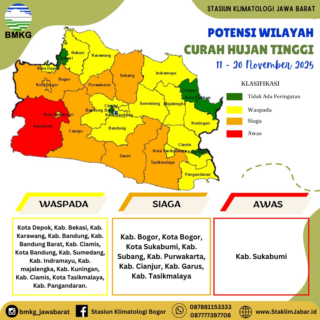 Peristiwa BMKG Provinsi Jawa Barat Keluarkan Peringatan Dini Curah Hujan Tinggi Penulis infokowasi - 10 November 2025 BMKG Provinsi Jawa Barat Keluarkan Peringatan Dini Curah Hujan Tinggi Redaksi : redaksi@infokowasi.comMarketing : marketing@infokowasi.com