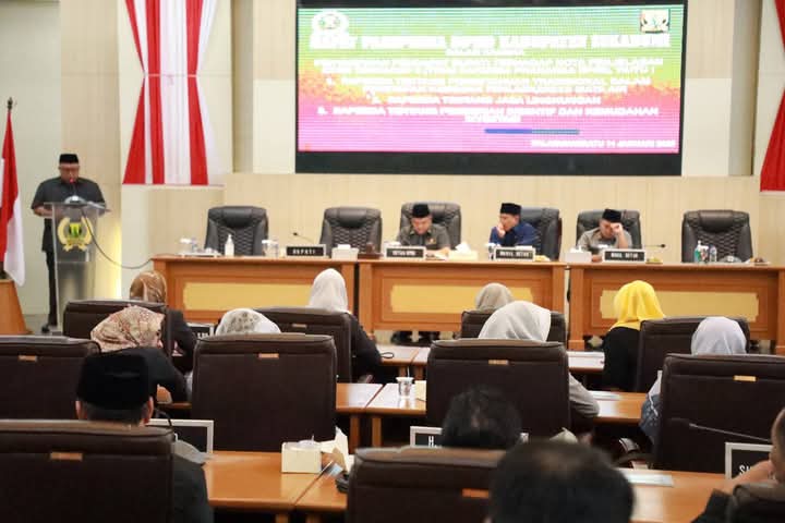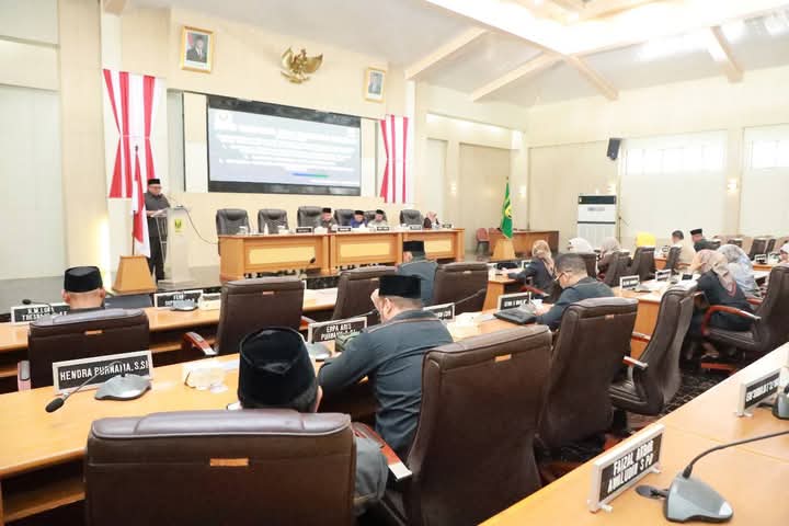 Infokowsi.com – Bupati Sukabumi H Marwan Hamami menyampaikan Nota Penjelasan DPRD atas Raperda tentang Pengetahuan Tradisional dalam Penetapan Kawasan Perlindungan Mata Air, Raperda tentang Pemberian Insentif dan Kemudahan Investasi, serta Raperda tentang Jasa Lingkungan pada Rapat Paripurna DPRD Kabupaten Sukabumi, di Ruang Rapat Paripurna DPRD, Palabuhanratu, Selasa (14/1/25).