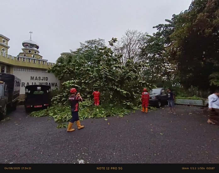 Kami menerima laporan dari pihak Satpol PP sekitar pukul 17.27 bahwa ada pohon tumbang di lingkungan kantor mereka. Tim langsung kami turunkan dengan empat anggota dan perlengkapan lengkap. Alhamdulillah, proses evakuasi berjalan lancar dan selesai sekitar pukul 18.00. Tidak ada korban jiwa dalam kejadian ini,” tandasnya