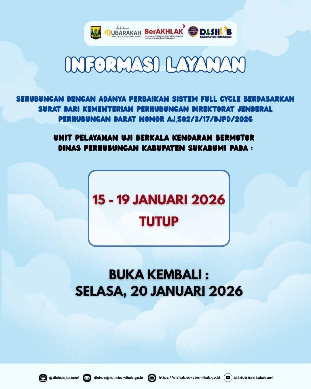 Infokowasi.com- Dinas Perhubungan Umumkan Unit Pelayanan Uji Berkala Kendaran Bermotor Tutup Untuk Sementara Dari Tanggal 15 -19 Januari 2026