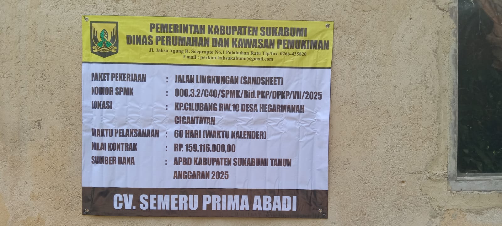 Pemkab Sukabumi melalui Disperkim Dinas Perumahan Kawasan dan Permukiman, Kabupaten Sukabumi mewujudkan pengaspalan jaling di Kampung Cilubang Kecamatan Cicantayan Kabupaten Sukabumi melalui dana dari APBD tahun 2025 sepanjang 1140 meter dengan jumlah anggaran Rp.159.116.000,00 yang dilaksanakan Rekanan dari CV SEMERU PRIMA ABADI.