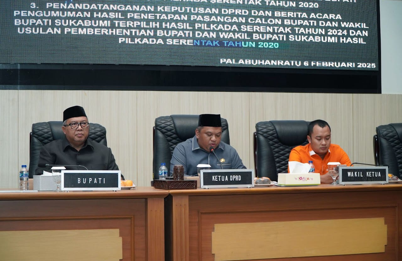 Infokowasi.com – Pada hari Kamis, 6 Februari 2025, Dewan Perwakilan Rakyat Daerah (DPRD) Kabupaten Sukabumi menggelar Rapat Paripurna yang memiliki tiga agenda penting sebagai bagian dari proses demokrasi di daerah. Rapat tersebut dipimpin oleh Ketua DPRD Kabupaten Sukabumi, Budi Azhar Mutawali, S.IP, didampingi oleh Wakil Ketua III DPRD, Ramzi Akbar Yusuf, SM, serta Bupati Sukabumi, Drs. H. Marwan Hamami, MM. Turut hadir dalam acara tersebut para Anggota DPRD, unsur Forkopimda, serta tamu undangan lainnya.