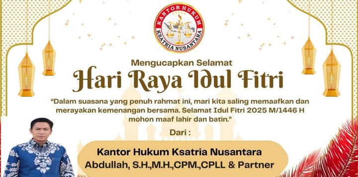 Kantor Hukum Ksatria Nusantara Mengucapkan Selamat Hari Raya Idul Fitri 1 Syawal 1446 H/2025 M Minal Aidzin Wal Faidzin Mohon Maaf Lahir Batin. (Robi)
