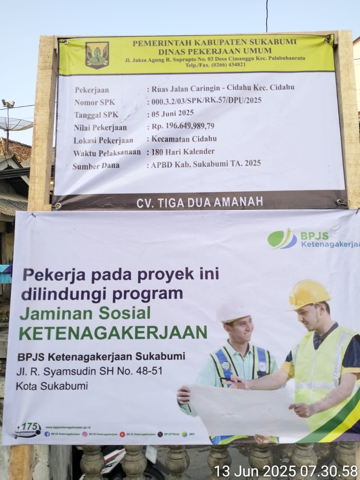 Berdasarkan hasil penelusuran pada Selasa 17 Juni 2025, anggaran proyek jalan tersebut bersumber dari APBD Kabupaten Sukabumi Tahun anggaran 2025 sebesar Rp196.649.989,79;-.
