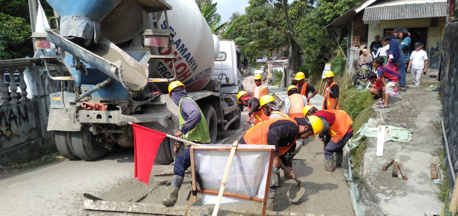 Yana salah seorang pekerja proyek mengemukakan pekerjaan jalan yang dilaksanakan oleh CV. Tiga Dua Amanah dengan panjang 50 m lebar 5 meter dan tinggi 30 cm tersebut menggunakan kontruksi beton bertulang.