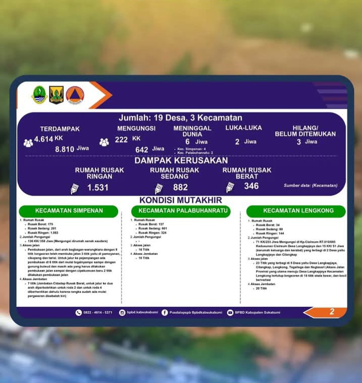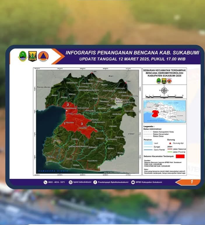 Infokowasi.com – Laporan sementara penanganan tanggap bencana banjir dan longsor di Kabupaten Sukabumi. Hingga 12 Maret 2025, tercatat 19 desa di 3 kecamatan terdampak dengan 8.810 jiwa terpengaruh.