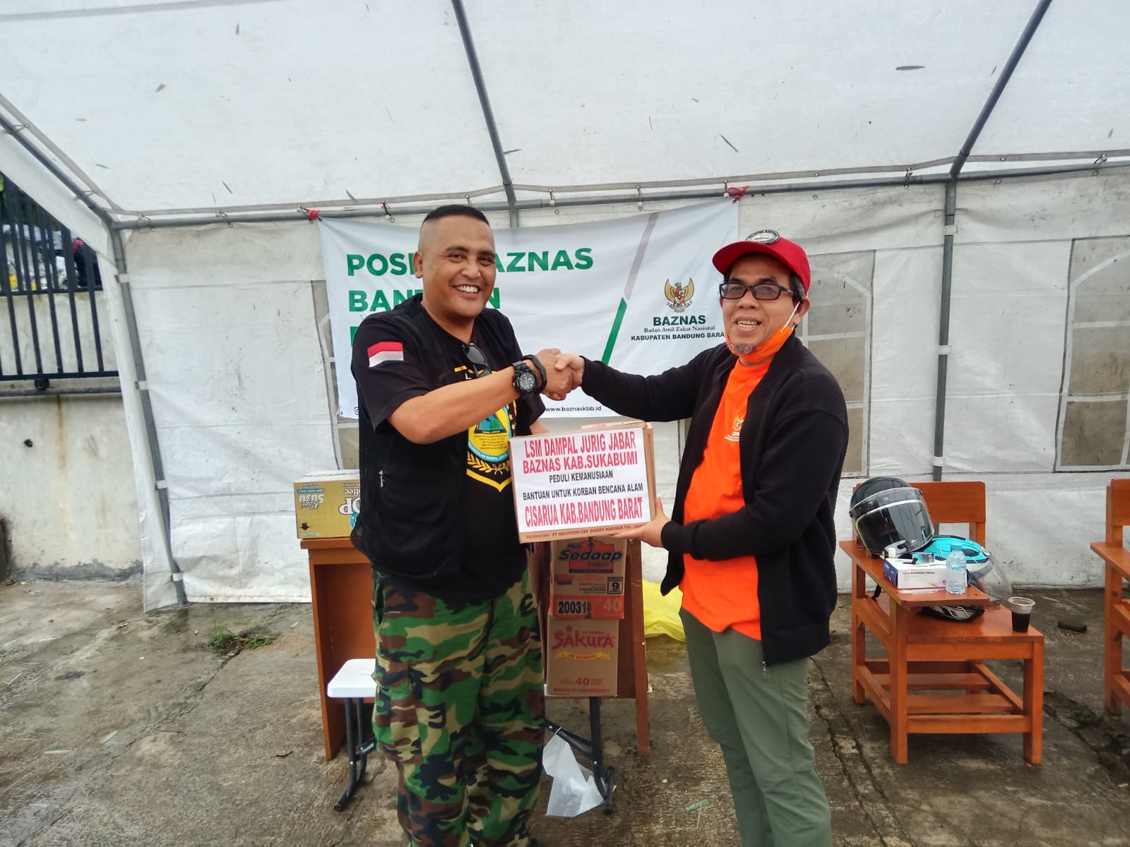 Adapun untuk hari ini dipusatkan disini untuk sedikit berbagi demi meringankan beban para korban bencana alam tanah longsor banjir bandang di pelosok wilayah desa pasir manggu Kecamatan Cisarua Kabupaten Bandung Barat dan ini tahap ke II penyalurannya yang kali ini menggandeng BAZNAS Kabupaten Sukabumi yang ikut mensupport bantuan paket sembako berikut armada mobil umat BAZNAS Kabupaten Sukabumi peduli untuk membawa bantuan logistik dari Kadudampit Sukabumi ke posko pengungsian Logistik Desa Pasir Langu Kecamatan Cisarua Adapun bantuan tersebut secara simbolis diberikan langsung Irvan Azis Ketua LSM Dampal jurig serta diterima oleh Wakil Ketua II BAZNAS Kabupaten Bandung Barat, tepatnya di posko logistik BAZNAS Kabupaten Bandung Barat.