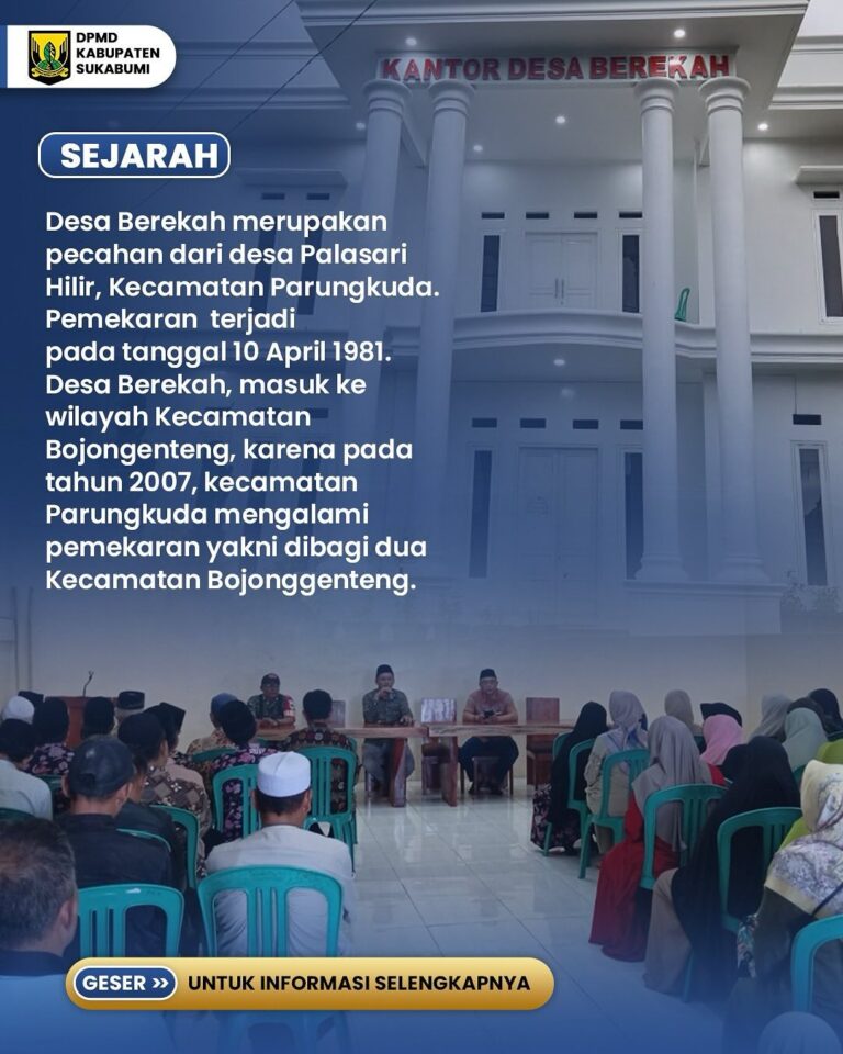 Infokowasi.com – Desa Berekah, yang terletak di Kecamatan Bojonggenteng, Kabupaten Sukabumi, menawarkan pesona alam yang luar biasa serta kekayaan budaya yang memikat. Dikenal dengan pemandangan alam hijau nan asri, desa ini tidak hanya menyuguhkan keindahan alam, tetapi juga memiliki masyarakat yang ramah, yang menjadikan setiap kunjungan terasa lebih hangat dan menyenangkan.