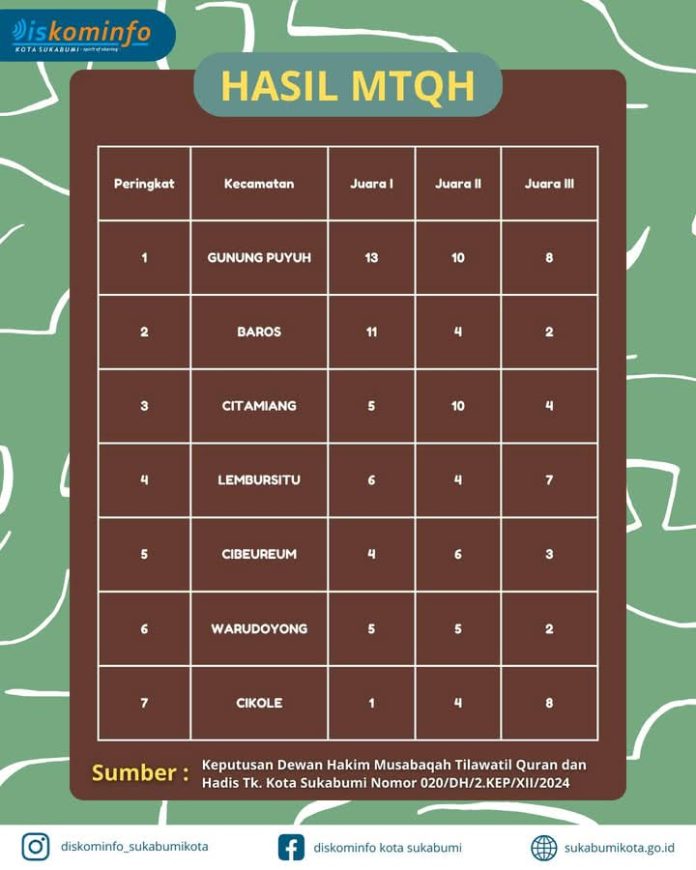 Infokowasi.com – Musabaqah Tilawatil Quran dan Hadis (MTQH) Kota Sukabumi telah berakhir pada 29 Desember 2024. Dalam ajang tersebut, Kecamatan Gunung Puyuh menduduki peringkat pertama.