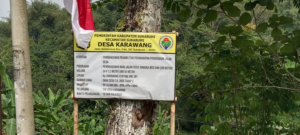 Pemerintah Desa (Pemdes) Karawang Kecamatan Sukabumi Kabupaten Sukabumi alokasikan Program Pembangunan Bahu jalan Desa (Rangka besi dan Cor Beton) volume 24 x 1,2 meter dan 50 meter melalui Dana Desa (DD) tahap 2, tahun 2025,dengan nilai Anggaran Rp45.000,000,- (PPh+PPn+ Adm) yang dilaksanakan oleh TPK Desa Karawang.