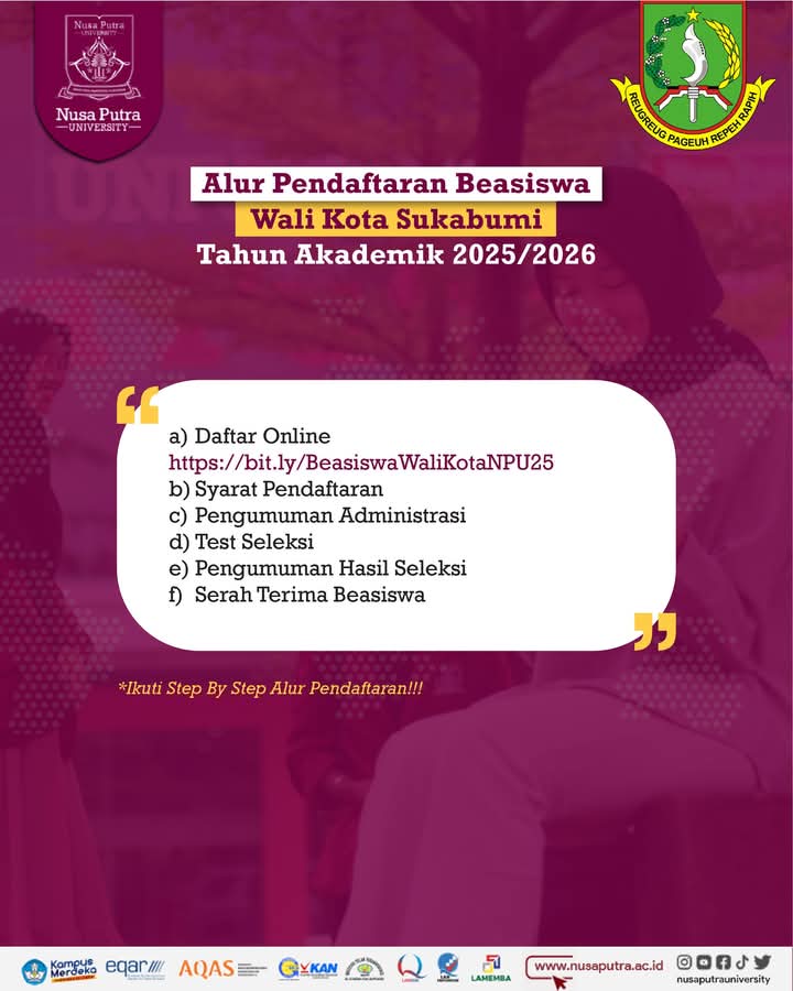 Infokowasi.com – Pemerintah Kota Sukabumi bekerja sama dengan Universitas Nusa Putra kembali membuka Program Beasiswa Wali Kota Sukabumi untuk tahun akademik 2025 / 2026.