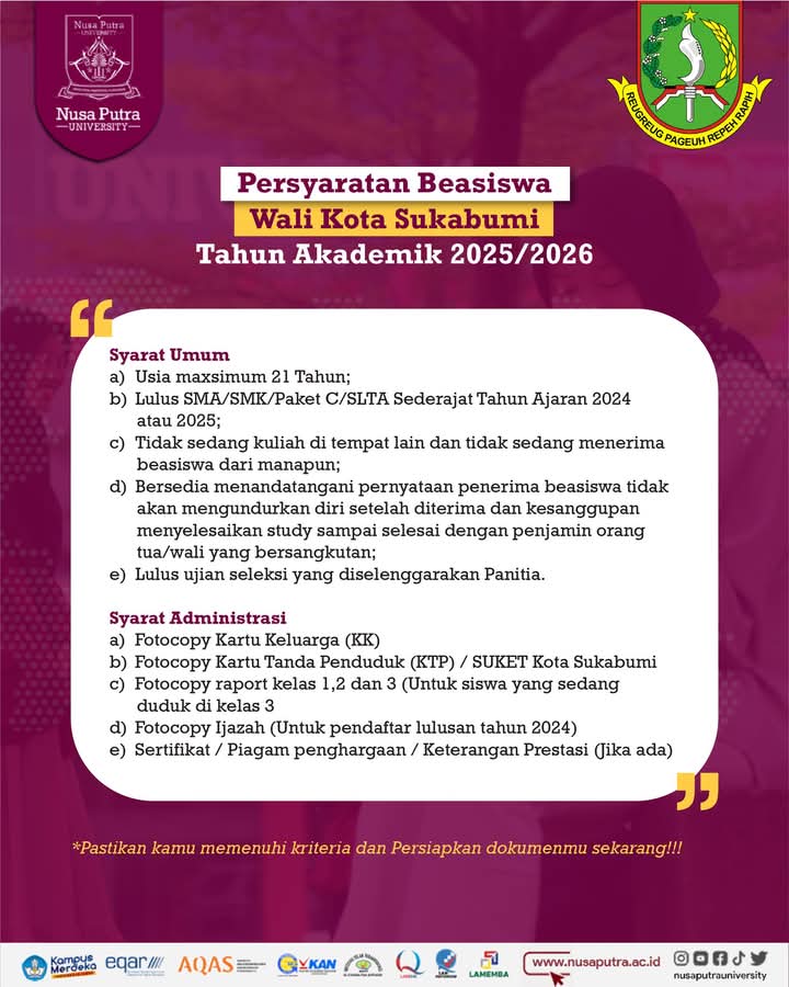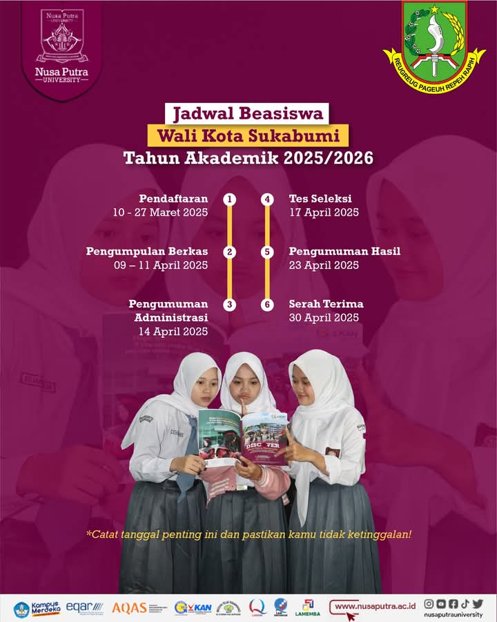 Infokowasi.com – Pemerintah Kota Sukabumi bekerja sama dengan Universitas Nusa Putra kembali membuka Program Beasiswa Wali Kota Sukabumi untuk tahun akademik 2025 / 2026.