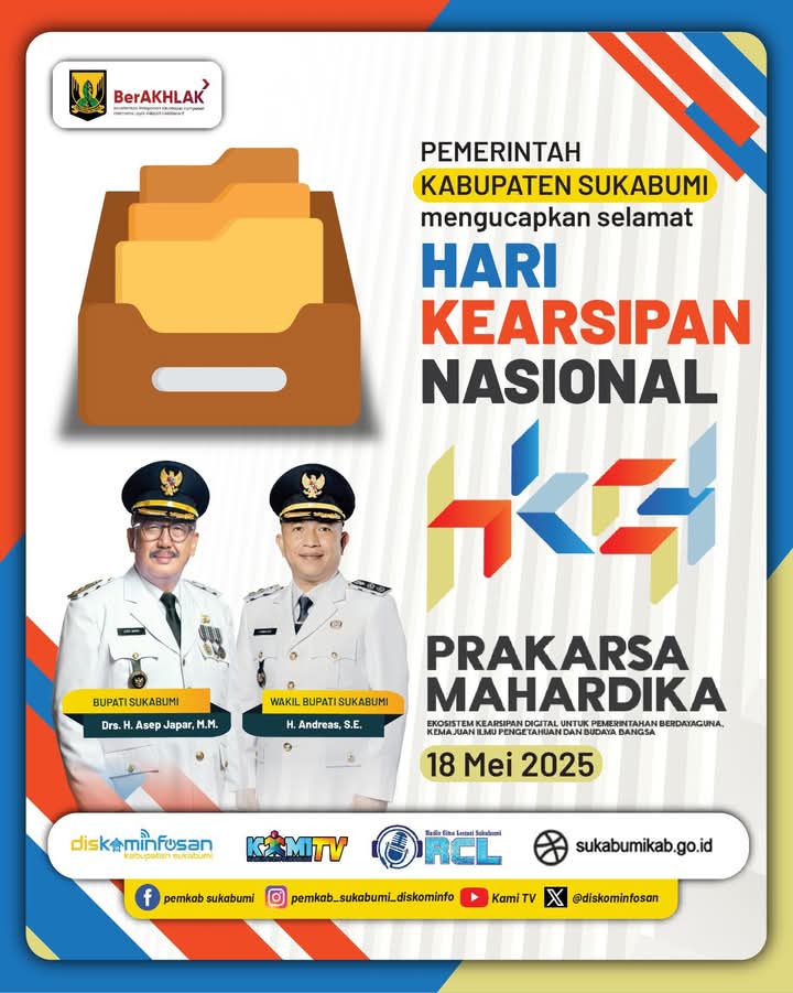 Pemerintahan Pemkab Sukabumi Mengucapkan Selamat Hari Kearsipan Nasional 18 Mei 2025 Penulis infokowasi - 17 Mei 2025 Pemkab Sukabumi Mengucapkan Selamat Hari Kearsipan Nasional 18 Mei 2025 Redaksi : redaksi@infokowasi.comMarketing : marketing@infokowasi.com