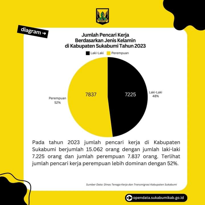 Pada tahun 2023 jumlah pencari kerja di Kabupaten Sukabumi berjumlah 15.062 orang dengan jumlah laki-laki 7.225 orang dan jumlah perempuan 7.837 orang, terlihat jumlah pencari kerja perempuan lebih dominan dengan 52%.