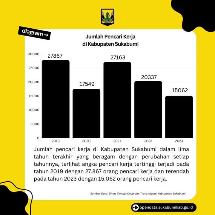 Infokowasi.com – Jumlah pencari kerja di Kabupaten Sukabumi dalam lima tahun terakhir yang beragam dengan perubahan setiap tahunnya, terlihat angka pencari kerja tertinggi terjadi pada tahun 2019 dengan 27.867 orang pencari kerja dan terendah pada tahun 2023 dengan 15.062 orang pencari kerja.