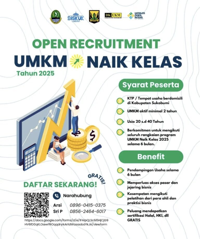 Infokowasi.com – Dinas Koperasi, Usaha Kecil dan Menengah (Dkukm) Kabupaten Sukabumi kembali menunjukkan komitmennya dalam mendorong pertumbuhan pelaku usaha mikro, kecil, dan menengah (UMKM) melalui program unggulan UMKM Naik Kelas 2025. Program ini resmi dibuka untuk pendaftaran dan ditujukan bagi para pelaku UMKM yang ingin mengembangkan usahanya secara lebih profesional dan berdaya saing tinggi.
