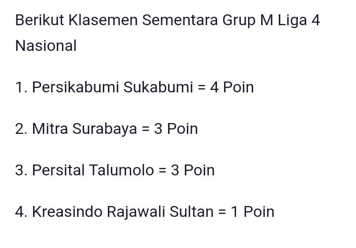 Tiga poin dari pertandingan ini, ditambah satu poin dari hasil imbang melawan Kreasindo FC, membuat Persikabumi mengumpulkan total 4 poin. Poin tersebut cukup untuk menempatkan Persikabumi di puncak klasemen Grup M, unggul atas Mitra Surabaya yang berada di posisi kedua dengan 3 poin (usai menang 3-1 atas Persital Talumolo). Persital Talumolo sendiri berada di posisi ketiga dengan 3 poin (usai menang 4-1 atas Kreasindo FC). Kreasindo FC saat ini berada di posisi buncit dengan 1 poin. (Redaksi)