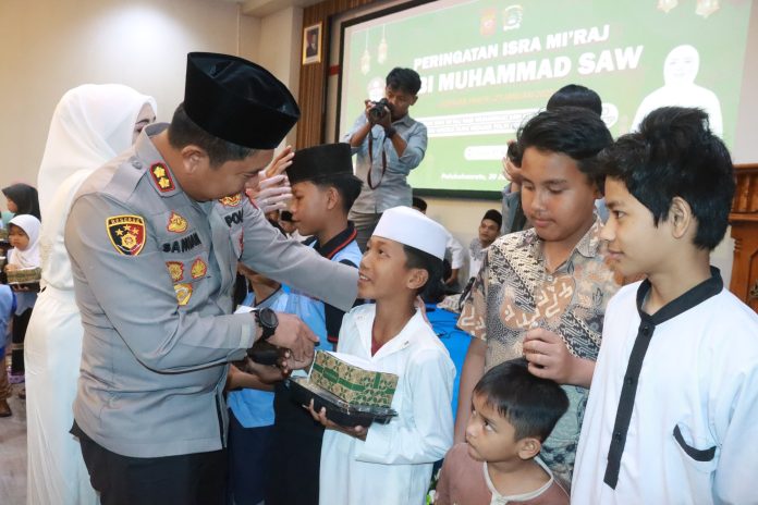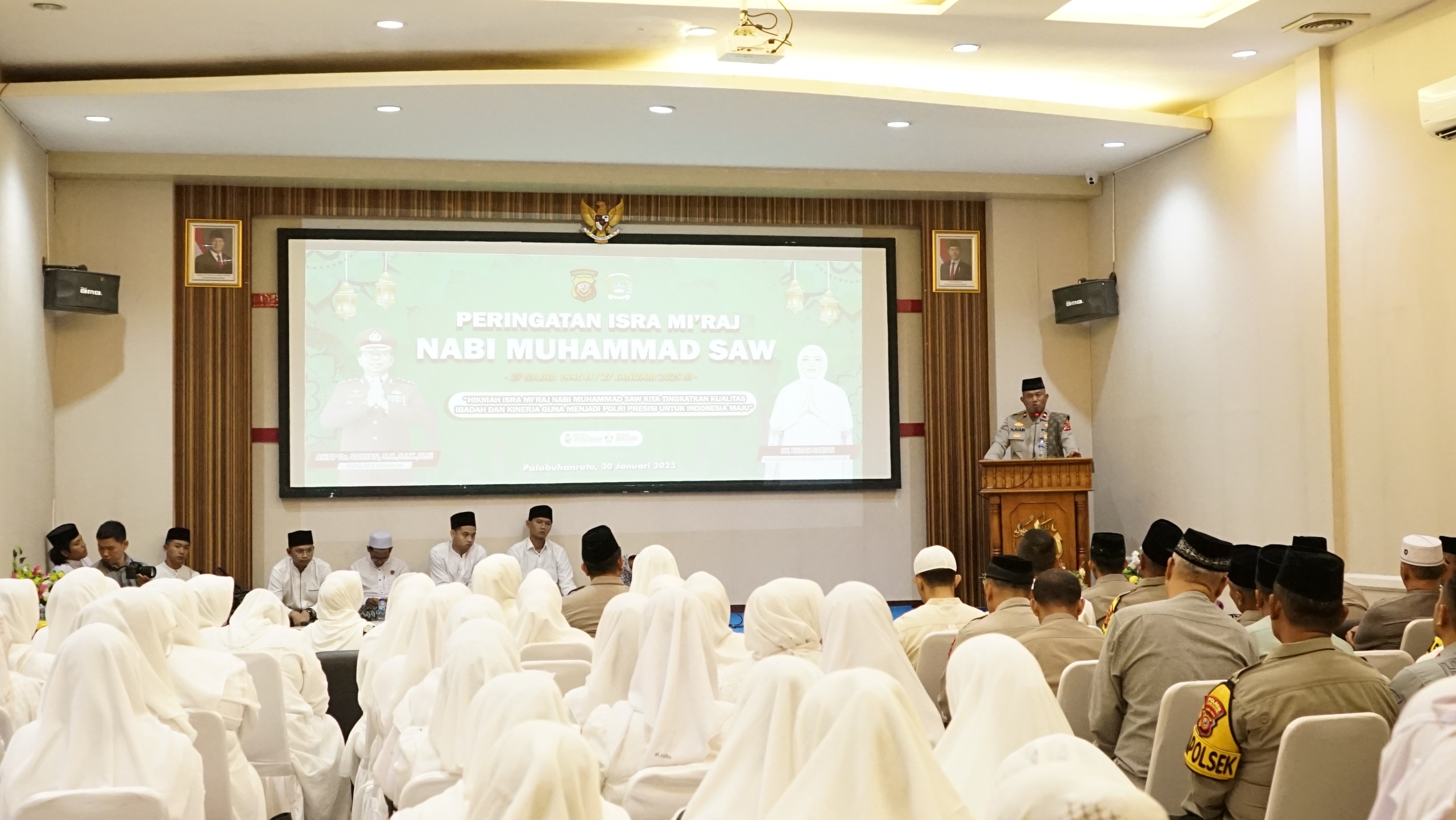 Infokowasi.com – Polres Sukabumi menggelar peringatan Isra’ Mi’raj Nabi Muhammad SAW 1446 H di Aula Rupatama Wicaksana Laghawa pada Kamis (30/1/2025). Kegiatan ini dihadiri oleh Kapolres Sukabumi AKBP Dr. Samian, S.H., S.I.K., M.Si., Ketua Bhayangkari Cabang Sukabumi Ny. Endah Samian, para Pejabat Utama (PJU) Polres Sukabumi, pengurus Bhayangkari, serta para santri dan santriwati dari Pondok Pesantren Al-Mubayyidliyyah.