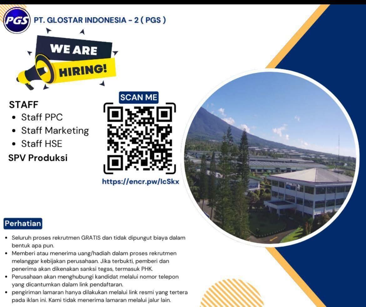PT. Glostar Indonesia – 2 (PGS) kembali membuka kesempatan berkarier bagi kalian yang dinamis, profesional, dan siap berkembang bersama kami.