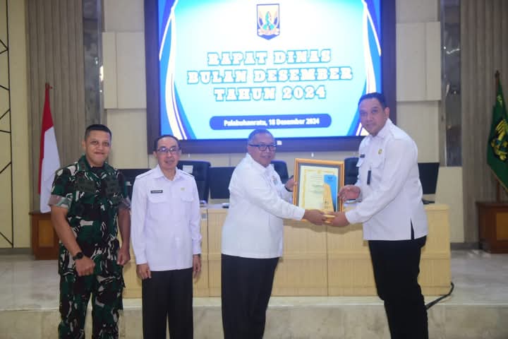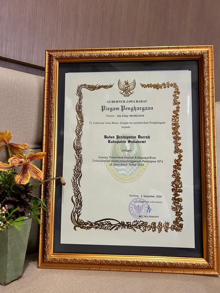 Sukabumi Innovation Award sebagai Perangkat Daerah peringkat inovasi terbaik ke 2 dari Bupati Sukabumi di aula Sekretariat Daerah Kabupaten Sukabumi Palabuhanratu, Rabu 18/12/2024.