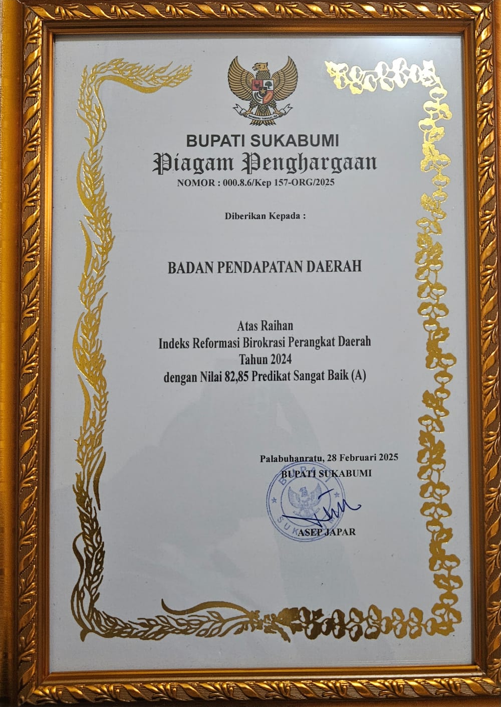 “Alhamdulillah Bapenda Kabupaten Sukabumi mendapat piagam penghargaan dari Bupati sukabumi atas raihan index reformasi Birokrasi perangkat daerah tahun 2024, dengan Nilai 82,85 , sehingga bapenda diberi predikat sangat baik dengan kategori A,” ucap Herdy Somantri selaku Kepala Badan Pendapatan Daerah Kabupaten Sukabumi, usai mengikuti rapat dinas bulanan di aula sekretariat daetah kabupaten sukabumi, Rabu (23/04/2025)