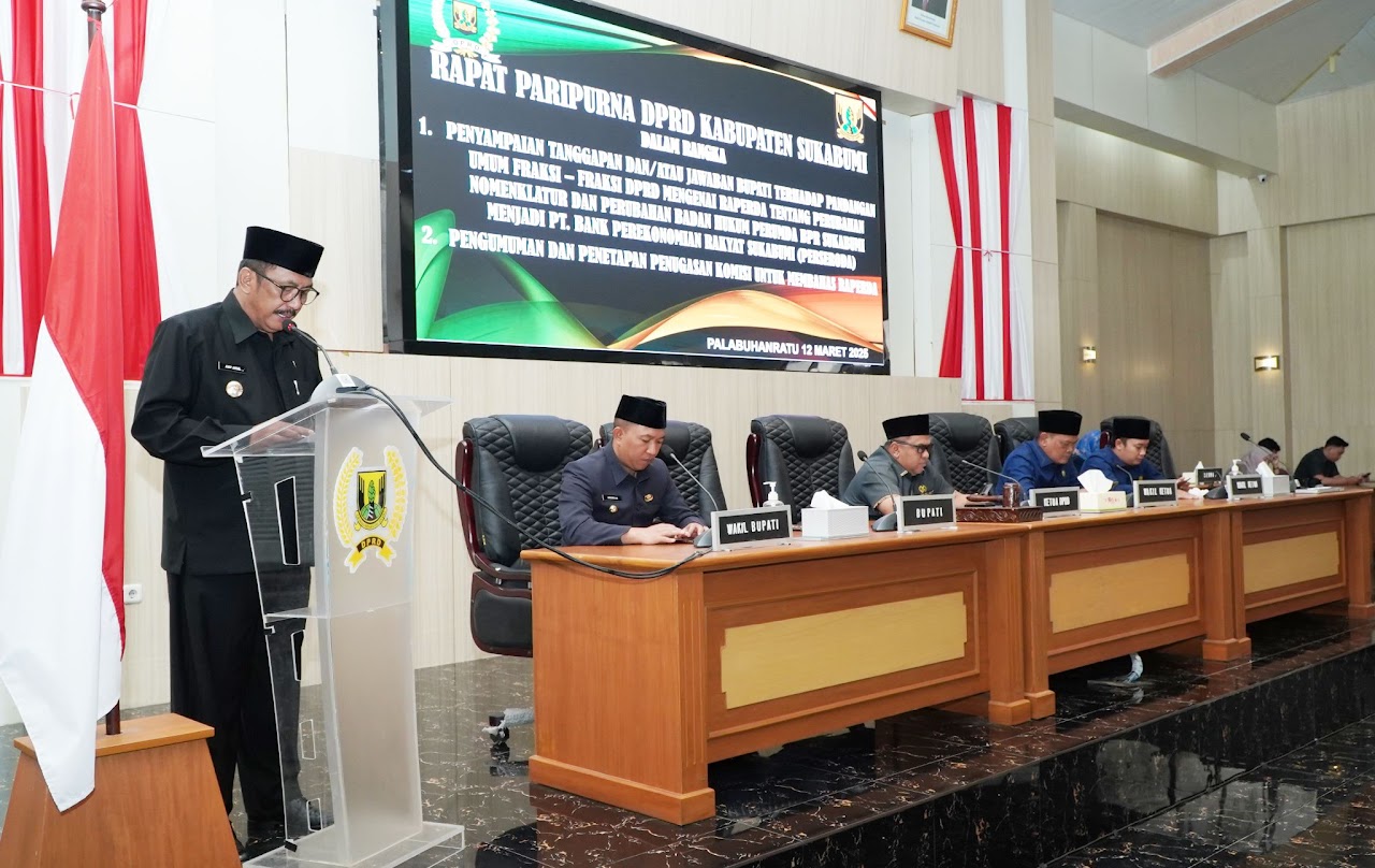 Dalam sambutannya, Bupati Sukabumi, Drs. H. Asep Japar, MM, menyampaikan jawaban atas pandangan umum fraksi-fraksi DPRD terkait Rancangan Peraturan Daerah (Raperda) perubahan nomenklatur Perumda Bank Perkreditan Rakyat (BPR) Sukabumi menjadi Perseroan Terbatas Bank Perekonomian Rakyat Sukabumi (Perseroda).