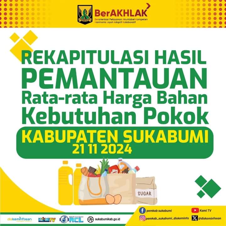 Rekapitulasi hasil pemantauan rata-rata harga bahan kebutuhan pokok di Kabupaten Sukabumi per 21 November 2024 telah tersedia.