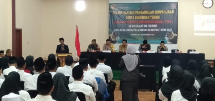 Acara pengambilan Sumpah Janji Jabatan PTPS digelar di Gedung Pesona Antariksa Desa Cidahu. Senin, 4 November 2024. Kegiatan tersebut dihadiri oleh anggota Komisioner Bawaslu Kabupaten Forkopimcam Cidahu, PPK dan Rohaniawan.