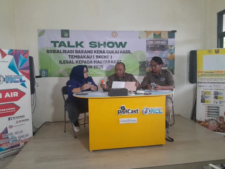 Infokowasi.com – Satuan Polisi Pamong Praja Kabupaten Sukabumi bersama Kantor Pengawasan dan Pelayanan Bea dan Cukai (KPPBC) Tipe Madya Pabean A Bogor menggelar talkshow sosialisasi tentang Barang Kena Cukai Hasil Tembakau (BKCHT) ilegal melalui siaran Radio Citra Lestari Sukabumi. Kegiatan ini bertujuan meningkatkan pemahaman masyarakat tentang bahaya peredaran rokok ilegal dan dampaknya terhadap negara.