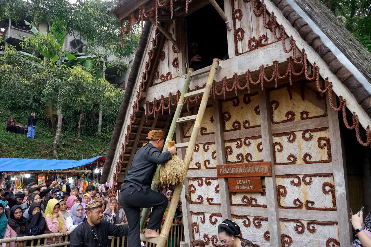 Puncak acara ditandai dengan prosesi Ngampih Pare ka Leuit, yakni upacara simbolik memasukkan ikat padi hasil panen ke dalam lumbung adat (Leuit) Si Jimat. Prosesi yang sarat nilai spiritual ini dipimpin langsung oleh Sesepuh Adat Kasepuhan Sinar Resmi, Abah Asep Nugraha.