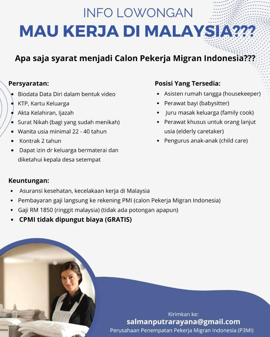 Infokowasi.com – Halo #SobatMigran telah dibuka kesempatan bagi yang ingin berkarir di Malaysia! Melalui P3MI PT. Salman Putra Rayana untuk posisi: