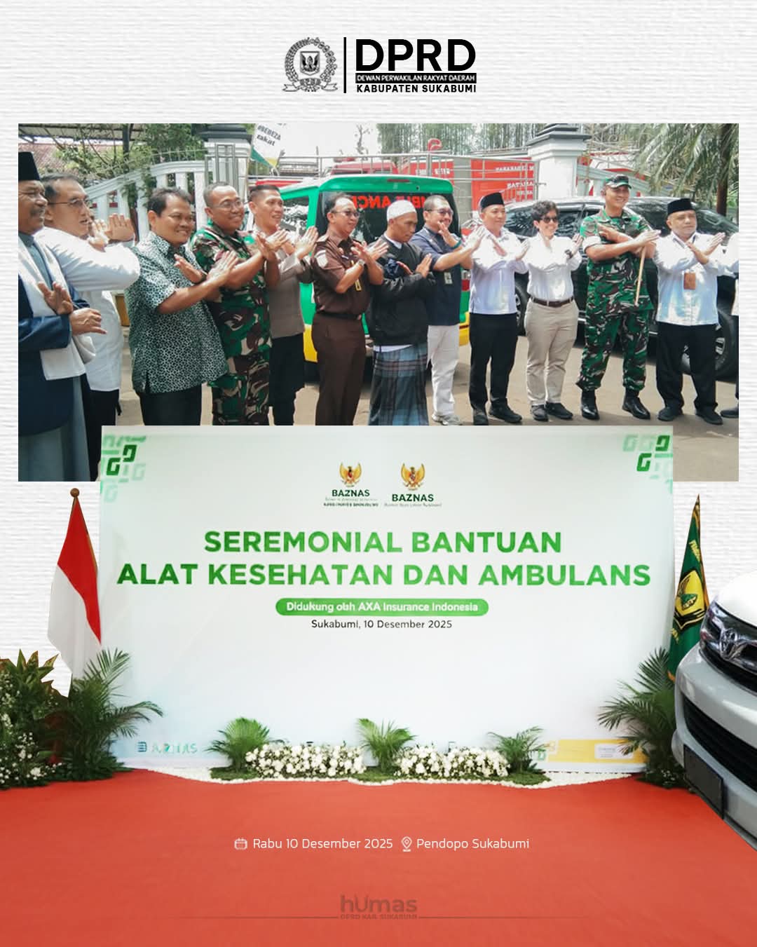 Infokowasi.com – Wakil Ketua II DPRD Kabupaten Sukabumi, H. Usep, menghadiri acara Seremonial Bantuan Alat Kesehatan dan Ambulans dari Baznas Republik Indonesia dan PT. AXA Insurance untuk Baznas Kabupaten Sukabumi, bertempat di Pendopo Sukabumi, Rabu (10/12/2025).